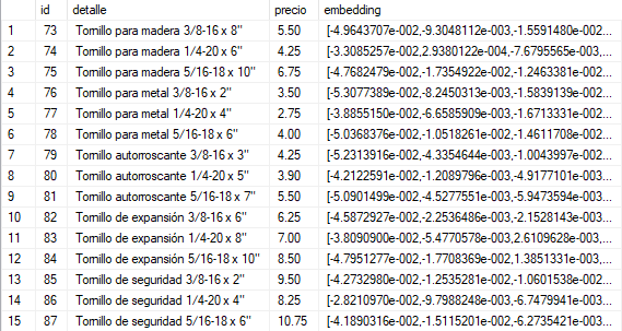 Previamente se hizo un procesado en la tabla de productos, donde se creó una columna embedding para guardar los vectores generados por el modelo text-embedding-ada-002 de OpenAI a cada detalle de producto.